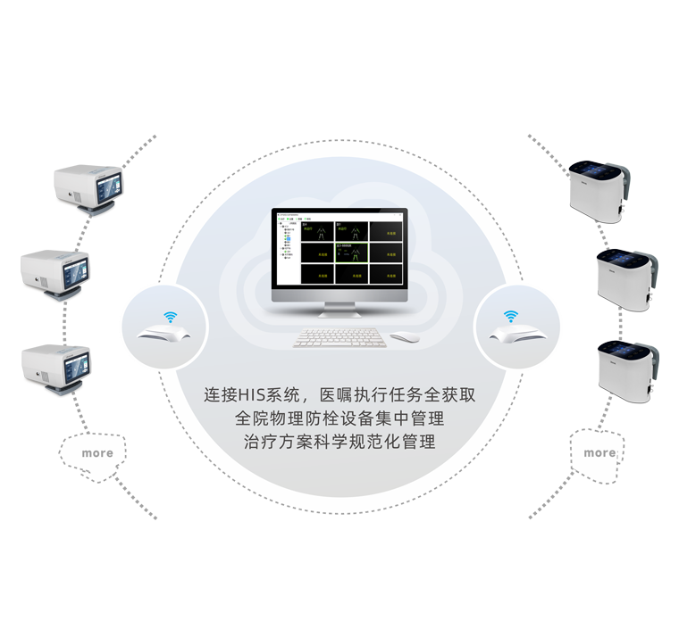 物理防栓中央工作站可将院内各科室散置管理的防栓设备(空气压力波治疗仪、间歇脉冲加压抗栓系统)在云端集中管理,实现治疗前、中、后的物理防栓治疗管理、实时监控、数据统计功能,打造物理防栓设备“云病房管理”管理模式。