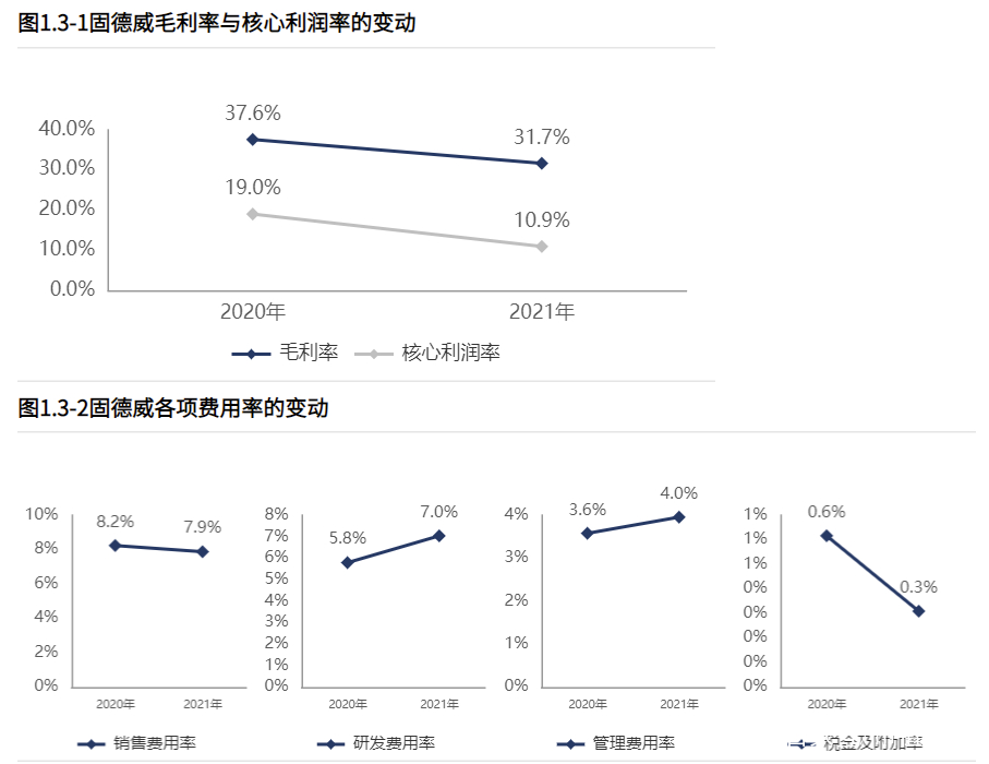 固德威2021年毛利率31.66%,毛利率水平较高,与2020年相比,毛利率下滑5.94个百分点,降幅15.80%;核心利润率10.94%,核心利润率水平较高,与2020年相比,核心利润率下滑8.07个百分点,降幅42.46%,经营活动盈利能力降低。核心利润率降低主要源于毛利率的降低。