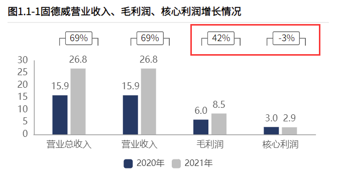 2021年营业总收入26.78亿元,其中营业收入26.78亿元,较2020年增加10.89亿元,销售收入快速增长;2021年毛利润8.48亿元,较2020年增加2.50亿元,毛利润快速增长;2021年核心利润2.93亿元,较2020年减少914.99万元,核心利润下滑。