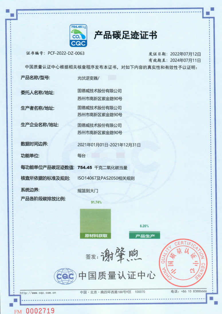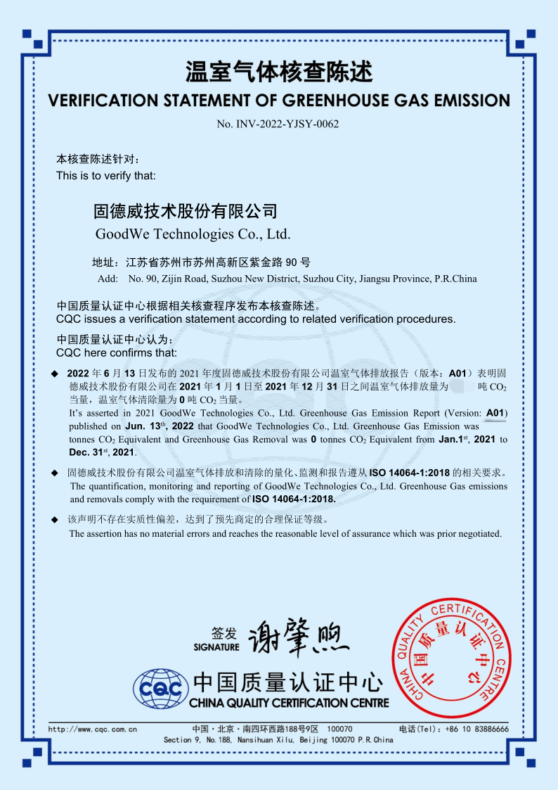 2022年7月,固德威获得由中国质量认证中心的双料认证,对其颁发产品碳足迹认证书及温室气体核查陈述认证证书,固德威不仅为客户提供智慧零碳解决方案,其自身也在不断践行绿色发展理念,充分体现了固德威作为一家大企业在绿色时代中的决心和担当。
