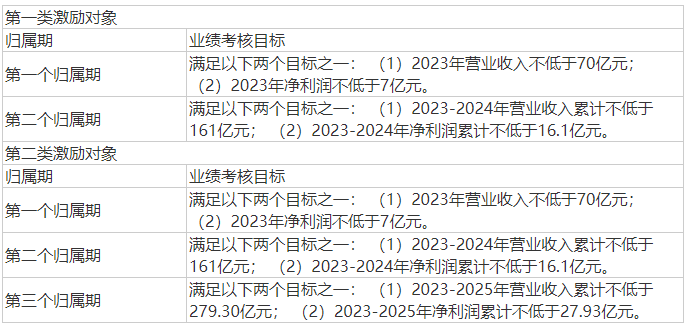 激励对象共分为两类,第一类激励对象为进入公司两年以上(含两年)的员工,第二类激励对象为进入公司两年以下的员工。固德威为首次授予限制性股票的两类激励对象设置了不同的考核要求,第一类激励对象的第一个归属期要求2023年营业收入不低于70亿元或净利润不低于7亿元,第二个归属期要求2023年-2024年营业收入累计不低于161亿元或净利润累计不低于16.1亿元。第二类激励对象则在第一类激励对象的基础上增加了第三个归属期的考核,即2023年-2025年营业收入累计不低于279.3亿元或净利润累计不低于27.93亿元。
