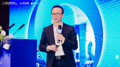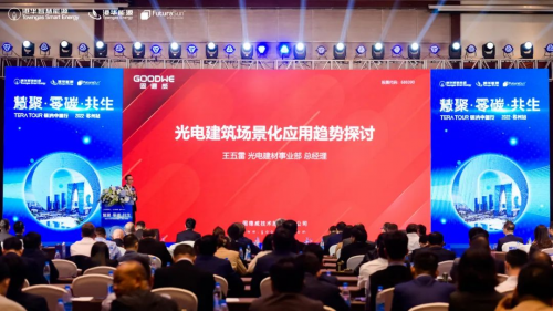 为零碳发展贡献固德威智慧,提供整体解决方案,固德威光电建材事业部总经理王五雷在现场为大家带来精彩演讲,分享了光电建筑场景化应用趋势探讨。