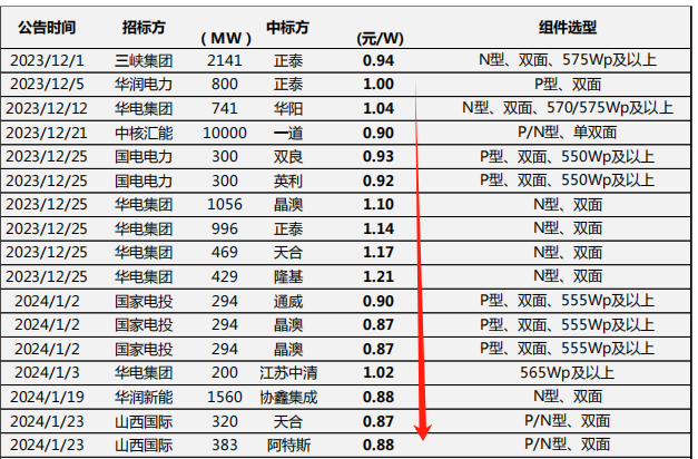 这也让光伏组件的价格不断降低。2024年1月央国企大型组件集采项目中,P型投标均价0.86-0.9元/W,TOPCon投标均价0.90-1.05元/W,价格中枢不断下滑。