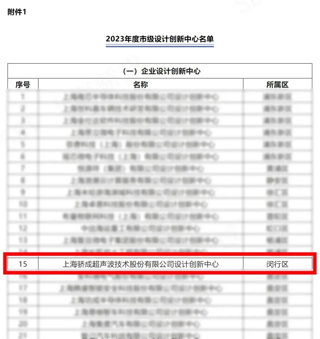 近日,上海市经济和信息化委员会发布了《上海市经济信息化委关于公布2023年度市级设计创新中心认定及复核结果的通知》,经过企业自主申报和市、区两级评审,新认定上海骄成超声波技术股份有限公司设计创新中心等41家市级设计创新中心。