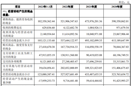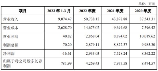 2020年-2022年及2023年1-3月,公司分别实现营业收入37,543.31万元、43,898.88万元、50,738.12万元和9,074.47万元;归属于母公司股东的净利润8,474.57万元、7,977.58万元、4,269.43万元和781.99万元;经营活动产生的现金流量净额9,142.60万元、5,961.44万元、971.64万元、-1,795.93万元。