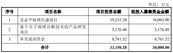 安必平昨晚披露的向不特定对象发行可转换公司债券预案显示,在考虑扣除本次发行董事会决议日(2023年5月29日)前六个月至今公司新投入和拟投入的财务性投资1,000.00万元的因素后,本次向不特定对象发行可转换公司债券募集资金总额不超过30,000.00万元(含本数),扣除发行费用后的募集资金净额将用于投入以下项目:安必平病理共建项目、基于分子病理诊断技术的产品研发项目、补充流动资金。