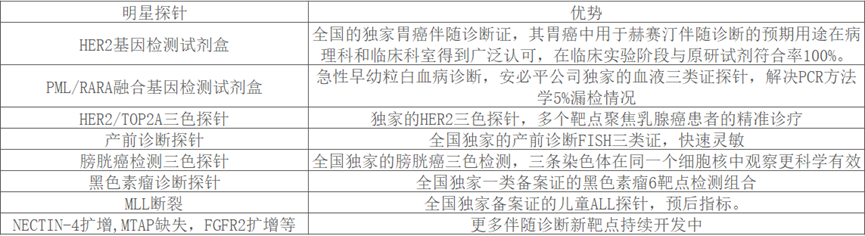 依托FISH技术平台,安必平积极联合医院、药厂开展新基因及伴随诊断靶点的合作开发与科研定制工作,例如:尿路上皮癌Nectin-4基因探针、胃癌FGFR2扩增探针(指导靶向药物使用)、三阴性乳腺癌MTAP基因探针(关联PARP抑制剂治疗)等。