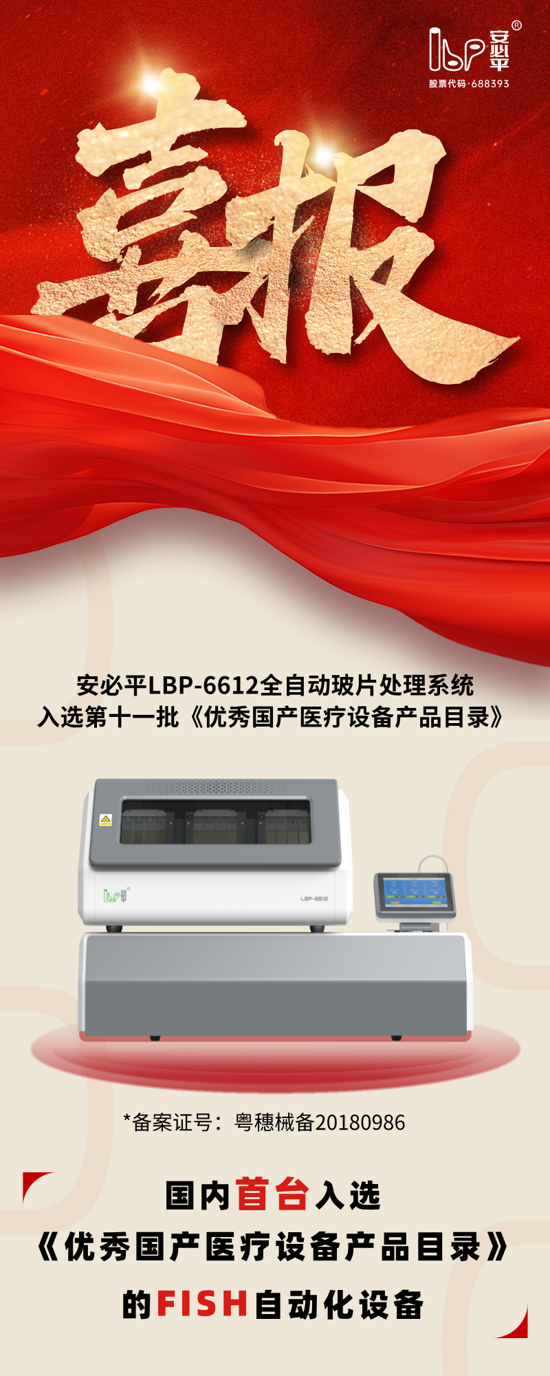 近日,广州安必平医药科技股份有限公司自主研发的LBP-6612全自动玻片处理系统成功入选第十一批《优秀国产医疗设备产品目录》。值得关注的是,这是首个跻身该目录的FISH(荧光原位杂交)设备!这一成果不仅是对安必平技术实力的权威认可,也彰显了国产分子病理设备在核心领域的发展潜力。