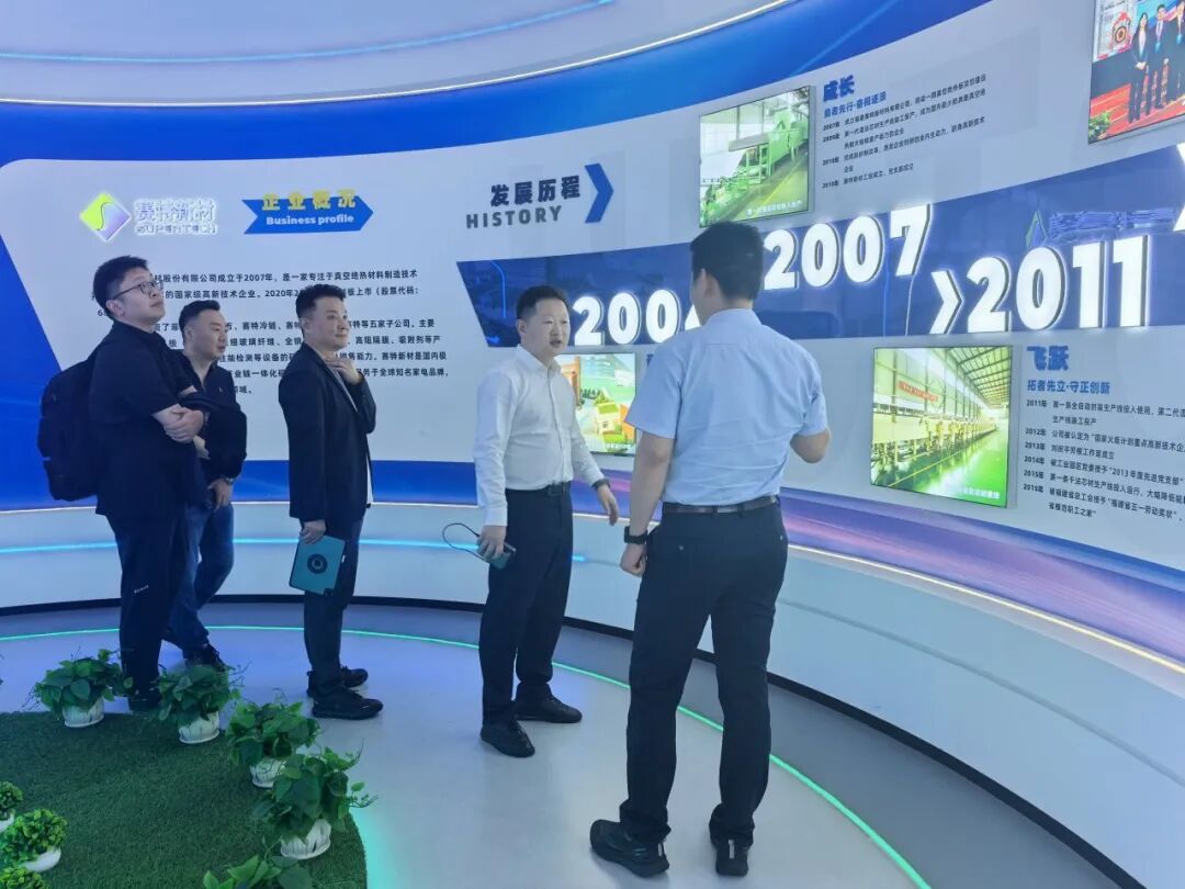赛特新材总经理严浪基等人热情接待了巨石集团领导沈国明一行,先后参观了赛特新材的企业展厅、产品生产线、研发实验室等,详细了解公司在真空绝热技术、材料创新、绿色低碳等领域的技术积累与产业化成果。