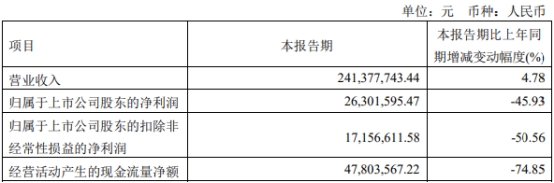 汇成股份2023年一季度报告显示,今年一季度,公司实现营业收入2.41亿元,同比增长4.78%;归属于上市公司股东的净利润2630.16万元,同比减少45.93%;归属于上市公司股东的扣除非经常性损益的净利润1715.66万元,同比减少50.56%;经营活动产生的现金流量净额4780.36万元,同比减少74.85%。