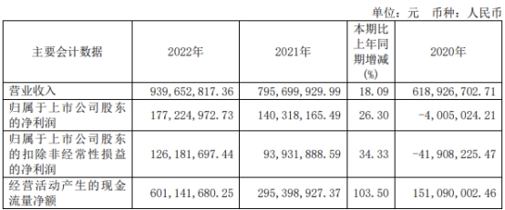 汇成股份2022年年度报告显示,2022年,公司营业收入为9.40亿元,同比增长18.09%;归属于上市公司股东的净利润为1.77亿元,同比增长26.30%;归属于上市公司股东的扣除非经常性损益的净利润为1.26亿元,同比增长34.33%;经营活动产生的现金流量净额为6.01亿元,同比增长103.50%。