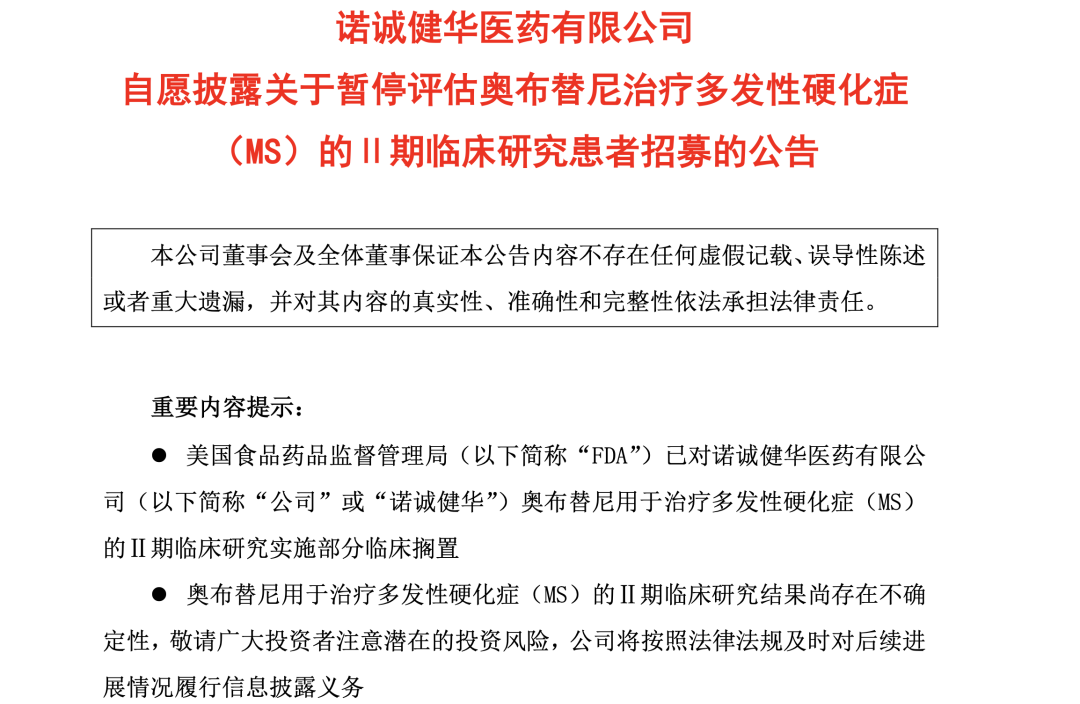 诺诚健华日前发布公告,因观察到肝损伤病例,美国FDA已对奥布替尼用于治疗多发性硬化症(MS)Ⅱ期临床研究实施部分临床搁置。因此,在美国进行的该临床研究不会开展新的患者招募,同时奥布替尼用于治疗该适应症的临床研究结果也存在不确定性。