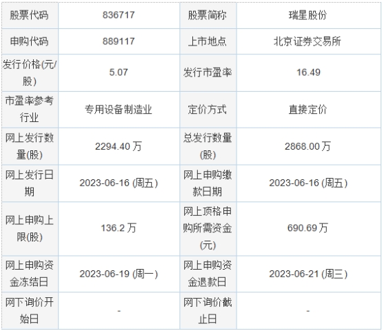 瑞星股份2023年6月13日发布向不特定合格投资者公开发行股票并在北京证券交易所上市发行公告,若本次发行成功,超额配售选择权行使前,预计公司募集资金总额14,540.76万元,扣除发行费用2,497.27万元(不含增值税)后,预计募集资金净额为12,043.49万元;若超额配售选择权全额行使,预计公司募集资金总额为16,721.87万元,扣除发行费用2,680.56万元(不含增值税),预计募集资金净额为14,041.31万元。