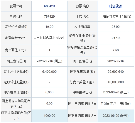时创能源2023年6月15日发布首次公开发行股票并在科创板上市发行公告,公司本次募投项目预计使用募集资金金额为1,095,974,900.00元。按本次发行价格19.20元/股和4,000.0800万股的新股发行数量计算,若本次发行成功,预计公司募集资金总额768,015,360.00元,扣除67,084,227.97元(不含增值税)的发行费用后,预计募集资金净额700,931,132.03元(如有尾数差异,为四舍五入所致)。