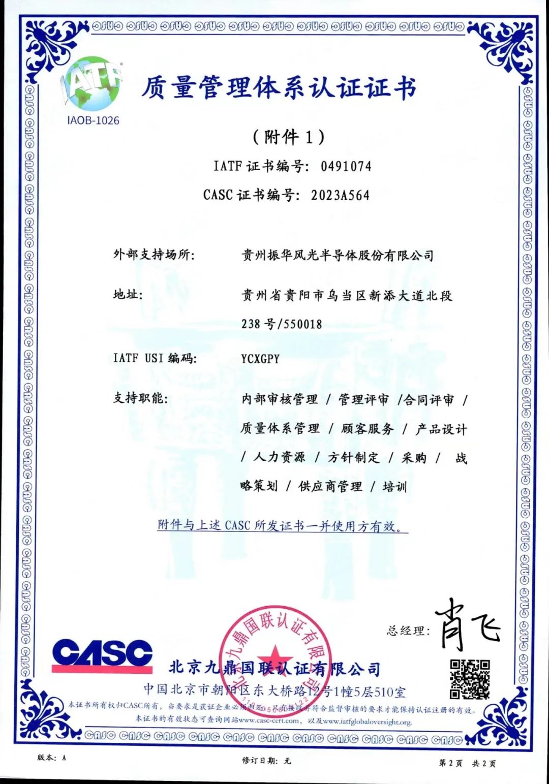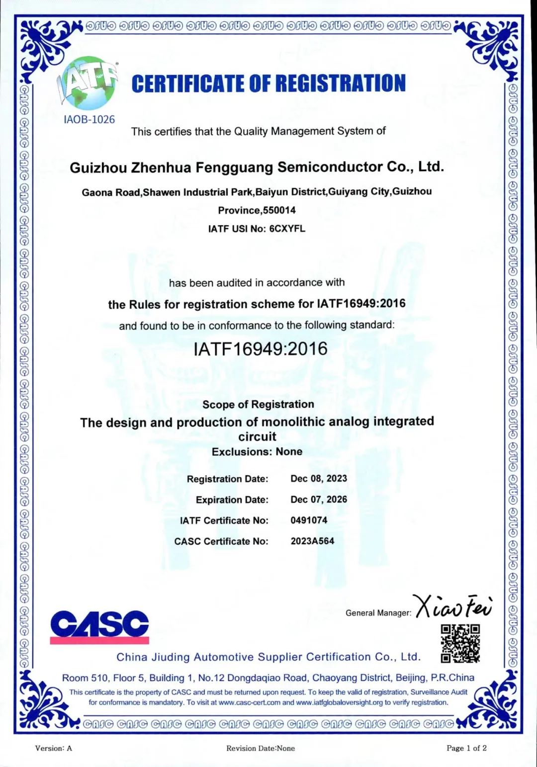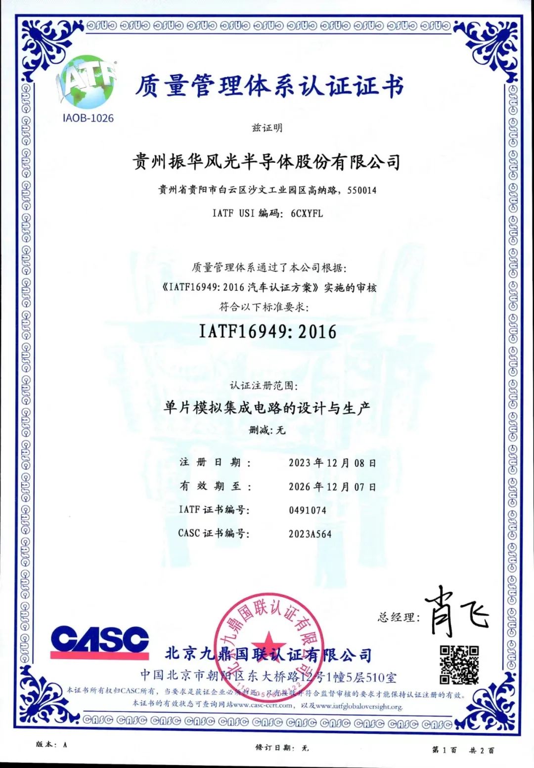 12月,振华风光顺利通过IATF16949:2016质量管理体系认证,并取得认证证书。认证注册范围为单片模拟集成电路的设计与生产。