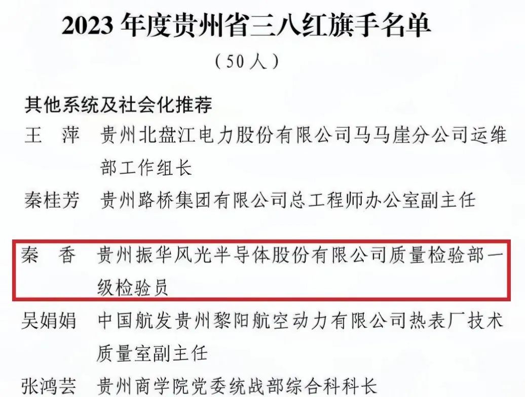 3月8日,贵州省妇联公布2023年度贵州省三八红旗手(集体)名单,授予50人“贵州省三八红旗手”称号、30个单位“贵州省三八红旗集体”称号。其中,振华风光秦香荣获“贵州省三八红旗手”称号。