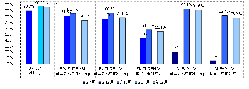 疗效更持久:GR1501用药第52周时PASI75未见明显下降,仍高达96.5%,而司库奇尤单抗在ERASURE试验、FIXTURE试验中第52周PASI75均较第16周明显下降,提示GR1501可能具有更持久疗效的潜力。