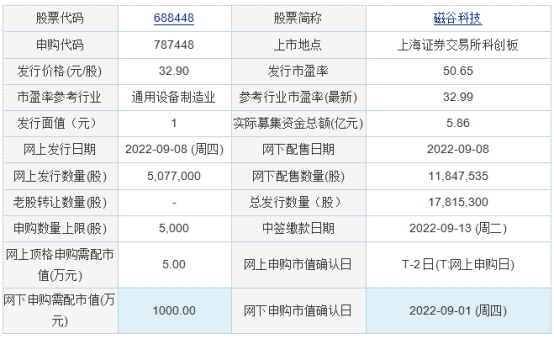 磁谷科技2022年9月7日披露的首次公开发行股票并在科创板上市发行公告显示,发行人本次募投项目预计使用募集资金金额为45,000.00万元。按本次发行价格32.90元/股和1,781.53万股的新股发行数量计算,若本次发行成功,预计发行人募集资金总额586,123,370.00元,扣除发行费用约57,554,870.38元(不含税)后,预计募集资金净额528,568,499.62元。