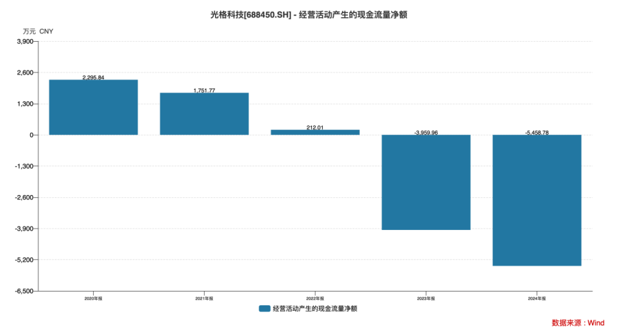 此外,光格科技经营现金流净额自2020年开始连续下跌,2023年转至-3959.96万元后,于2024年进一步恶化至-5458.78万元。