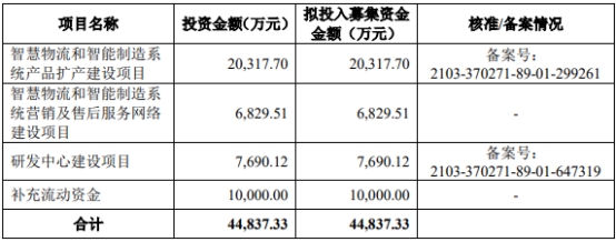 科捷智能募集资金总额98,924.49万元,募集资金净额89,137.11万元,较原计划多44,299.78万元;公司2022年9月9日披露的招股书显示,公司拟募集资金44,837.33万元,计划用于智慧物流和智能制造系统产品扩产建设项目、智慧物流和智能制造系统营销及售后服务网络建设项目、研发中心建设项目、补充流动资金。