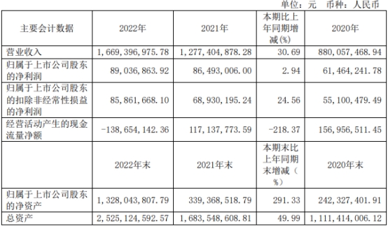 科捷智能2022年营业收入为16.69亿元,同比增长30.69%;归属于上市公司股东的净利润8903.69万元,同比增长2.94%;归属于上市公司股东的扣除非经常性损益的净利润为8586.17万元,同比增长24.56%;经营活动产生的现金流量净额为-1.39亿元,上年同期为1.17亿元。