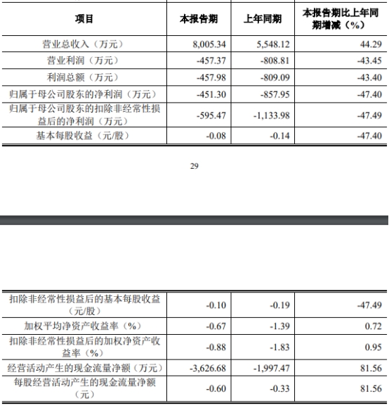 2023年一季度美芯晟营业总收入为8,005.34万元,同比增长44.29%;归属于母公司股东的净利润为-451.30万元,上年同期为-857.95万元;归属于母公司股东的扣除非经常性损益后的净利润-595.47万元,上年同期为-1,133.98万元;经营活动产生的现金流量净额-3,626.68万元,上年同期为-1,997.47万元。