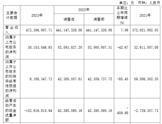 2023年,公司实现营业收入4.72亿元,同比增长7.06%;归母净利润3015.35万元,同比下降42.67%;扣非净利润616.83万元,同比下降85.45%;经营活动产生的现金流量净额为-1.53亿元,上年同期为4239.56万元。