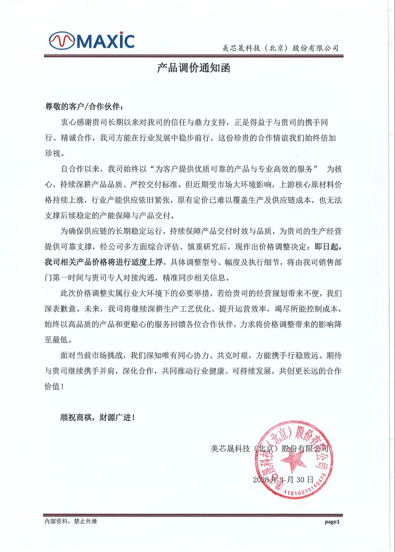 今日,充电头网从行业内获悉,美芯晟科技(北京)股份有限公司正式发布产品调价通知函,宣布即日起对相关产品价格进行适度上浮,以应对当前上游核心原材料价格上涨、行业产能紧张的市场挑战。
