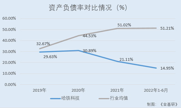 据东方财富choice数据,2019-2021年及2022年1-6月,哈铁科技的资产负债率分别为29.63%、30.89%、21.11%、14.95%。