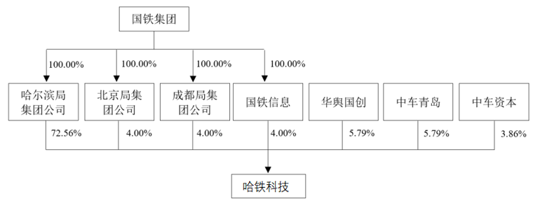 截至2022年9月16日,中国国家铁路集团有限公司(以下简称“国铁集团”)通过哈尔滨局集团公司、北京局集团公司、成都局集团公司和国铁信息合计持有哈铁科技84.56%股权,为其实际控制人。