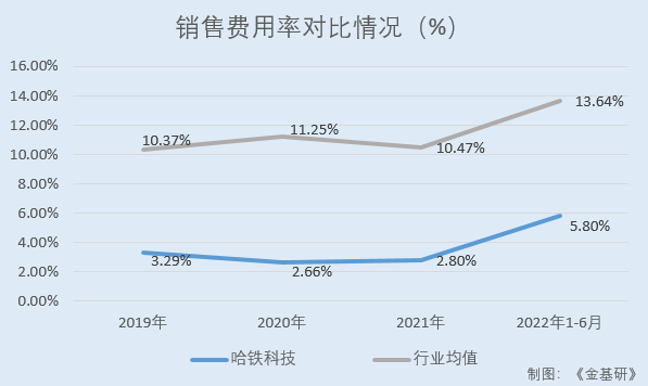 由此,哈铁科技的销售费用率大幅低于同行业可比公司均值。