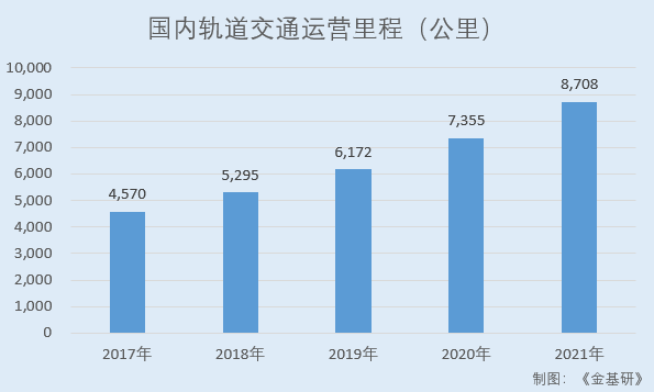 与此同时,近年来国内城市轨道交通发展迅猛。据国家统计局数据,2017-2021年,国内轨道交通运营里程分别为4,570公里、5,295公里、6,172公里、7,355公里、8,708公里。