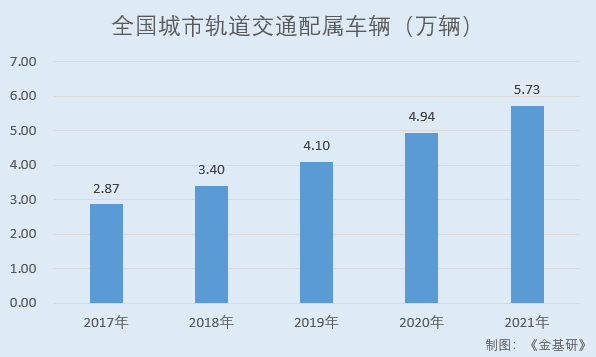 由此,国内城市轨道交通配属车辆数逐年上涨。据2021年交通运输行业发展统计公报数据,2017-2021年,全国城市轨道交通配属车辆分别为2.87万辆、3.40万辆、4.10万辆、4.94万辆、5.73万辆。