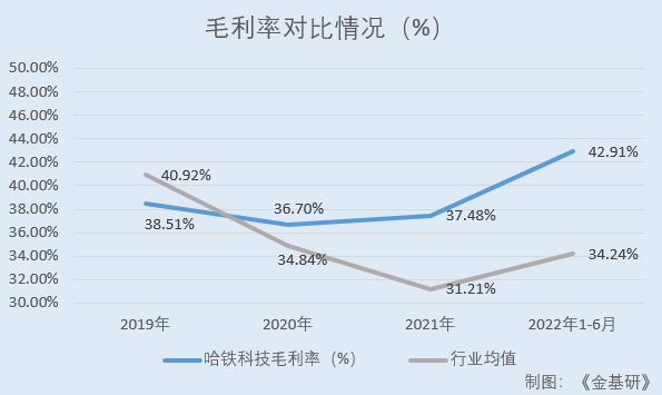 据东方财富choice数据,2019-2021年及2022年1-6月,哈铁科技的毛利率分别为38.51%、36.70%、37.48%、42.91%。