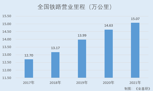 在铁路交通方面,随着国内国民经济及铁路事业的不断发展,国内铁路运营里程也在不断增长。据国家统计局数据,2017-2021年,全国铁路营业里程分别为12.70万公里、13.17万公里、13.99万公里、14.63万公里、15.07万公里。