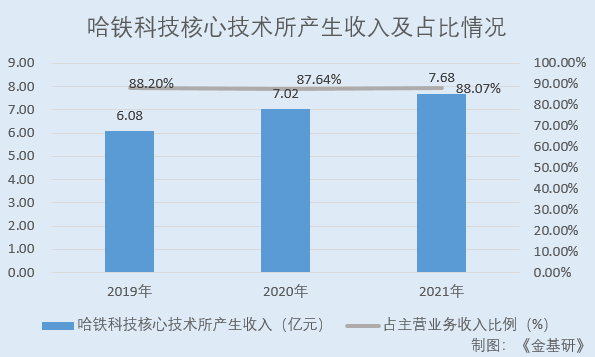在研发技术产业化方面,2019-2021年,哈铁科技依靠核心技术开展生产经营产生的收入分别为6.08亿元、7.02亿元、7.68亿元,占当期主营业务收入的比重分别为88.20%、87.64%、88.07%,产研高度融合。