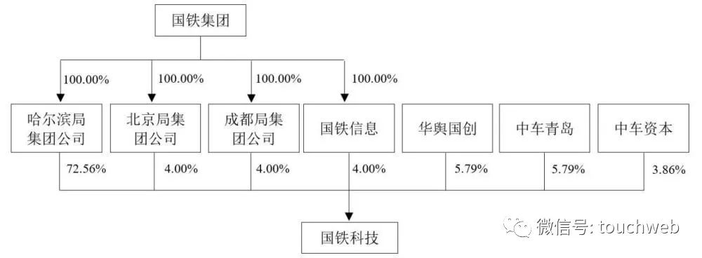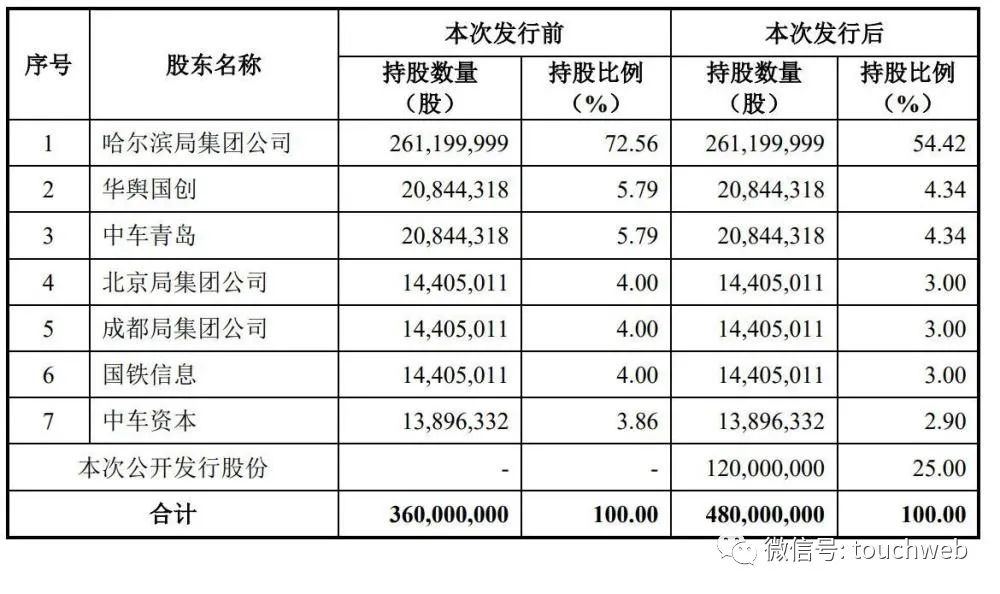 IPO后,哈尔滨局集团公司持股为54.42%,华舆国创、中车青岛分别持股为4.34%,北京局集团公司、成都局集团公司、国铁信息分别持股为3%,中车资本持股为2.9%。
