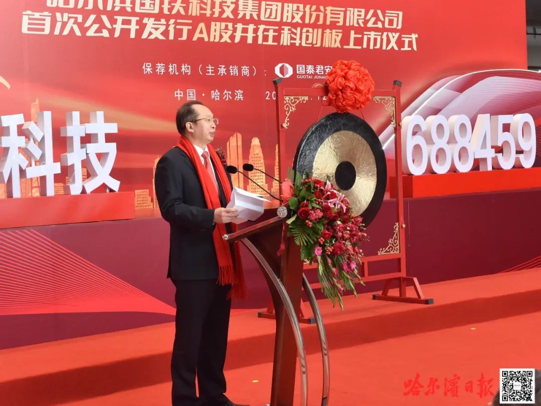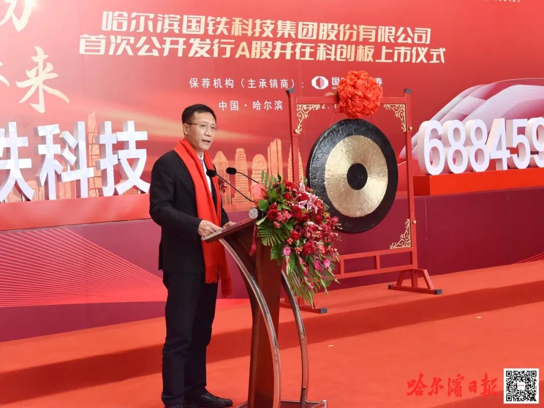 王一新在致辞中说,哈尔滨国铁科技成功登陆资本市场,为我省上市公司队伍再添生力军。近年来,省委、省政府深入贯彻习近平总书记对我省重要讲话重要指示精神,大力发展资本市场,组织实施企业上市“紫丁香计划”,强化政策引导、优化服务环境、培育上市资源,推动优质企业实现上市融资。全省上市发行企业、在审企业、备案辅导企业、上市后备企业数量,都创历史最好水平。哈尔滨国铁科技集团要以上市为契机,落实好募投项目,深耕核心技术、延伸产业链条、提高治理水平,打造行业硬核实力,不断拓展壮大国际国内市场,为龙江振兴发展作出新的更大贡献。同时,期待哈铁集团旗下更多优秀公司早日上市。