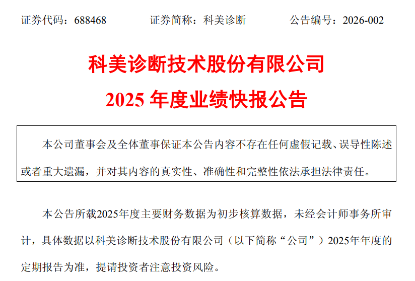 2026年2月27日,科美诊断[688468]发布2025年度业绩快报。报告期内,公司整体经营承压,收入与利润均出现明显下滑,行业集采深化与费用投入加大成为核心影响因素。