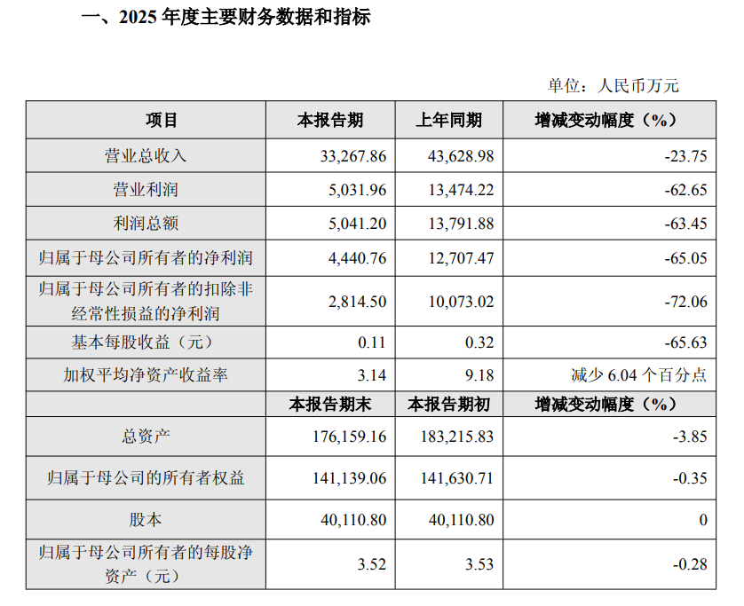 2025年,公司实现营业总收入3.33亿元,同比下降23.75%;实现归母净利润0.44亿元,同比下降65.05%;扣非净利润为0.28亿元,同比下降72.06%。
