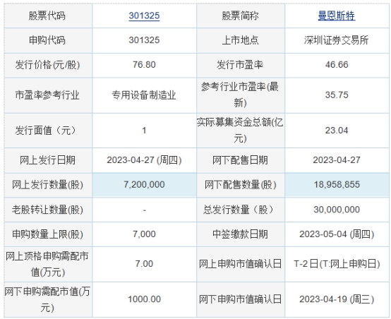 曼恩斯特2023年4月26日发布的首次公开发行股票并在创业板上市发行公告显示,若本次发行成功,预计公司募集资金总额为230,400.00万元,扣除发行费用约19,710.52万元(不含增值税)后,预计募集资金净额约为210,689.48万元。