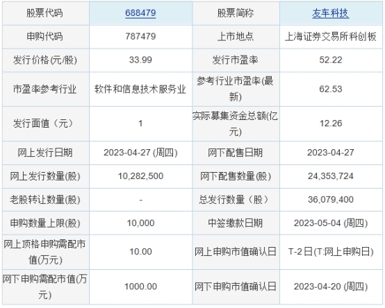 友车科技2023年4月26日发布的首次公开发行股票并在科创板上市发行公告显示,公司本次募投项目预计使用募集资金金额为56,310.87万元。按本次发行价格33.99元/股和3,607.94万股的新股发行数量计算,若本次发行成功,预计公司募集资金总额122,633.88万元,扣除约14,093.53万元(不含增值税)的发行费用后,预计募集资金净额108,540.35万元(如有尾数差异,为四舍五入所致)。