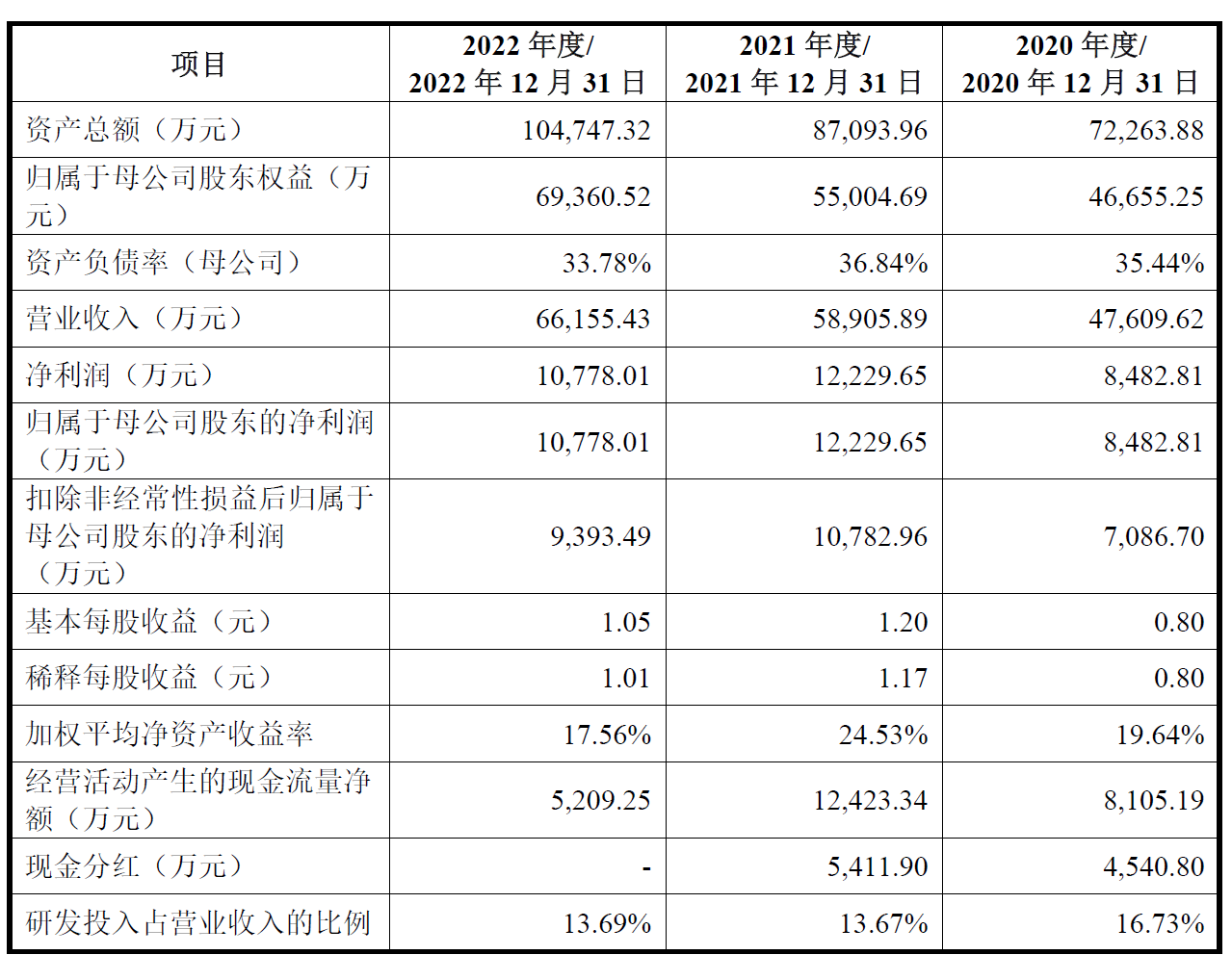 2020年至2022年,友车科技的营业收入分别为47,609.62万元、58,905.89万元和66,155.43万元;净利润/归属于母公司股东的净利润分别为8,482.81万元、12,229.65万元和10,778.01万元;扣除非经常性损益后归属于母公司股东的净利润分别为7,086.70万元、10,782.96万元和9,393.49万元。
