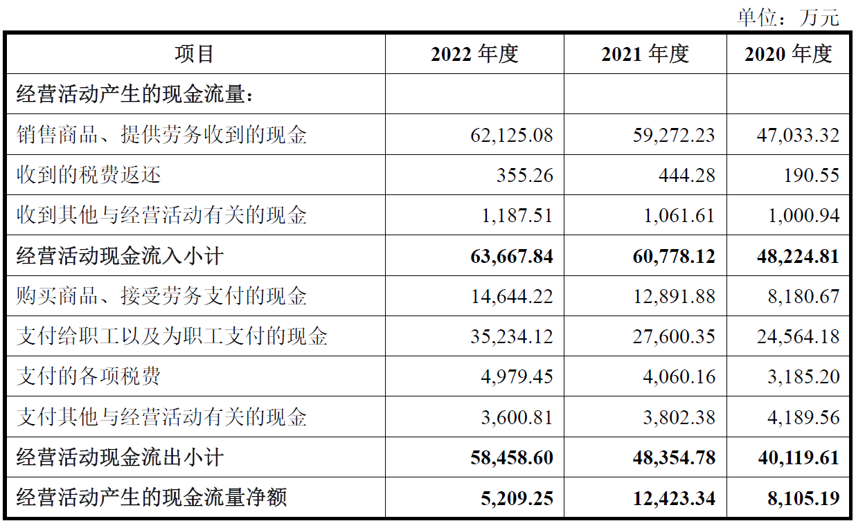 上述同期,公司销售商品、提供劳务收到的现金分别为47,033.32万元、59,272.23万元和62,125.08万元;经营活动产生的现金流量净额分别为8,105.19万元、12,423.34万元和5,209.25万元。