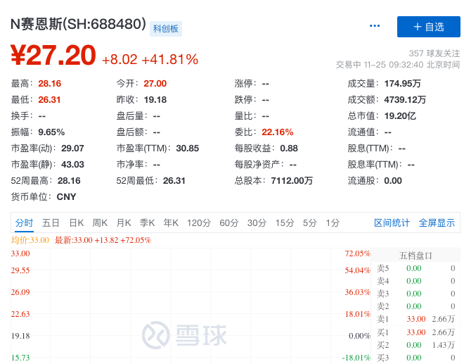 截至9:32,N赛恩斯报涨41.81%,报27.2元,总市值19.2亿元。