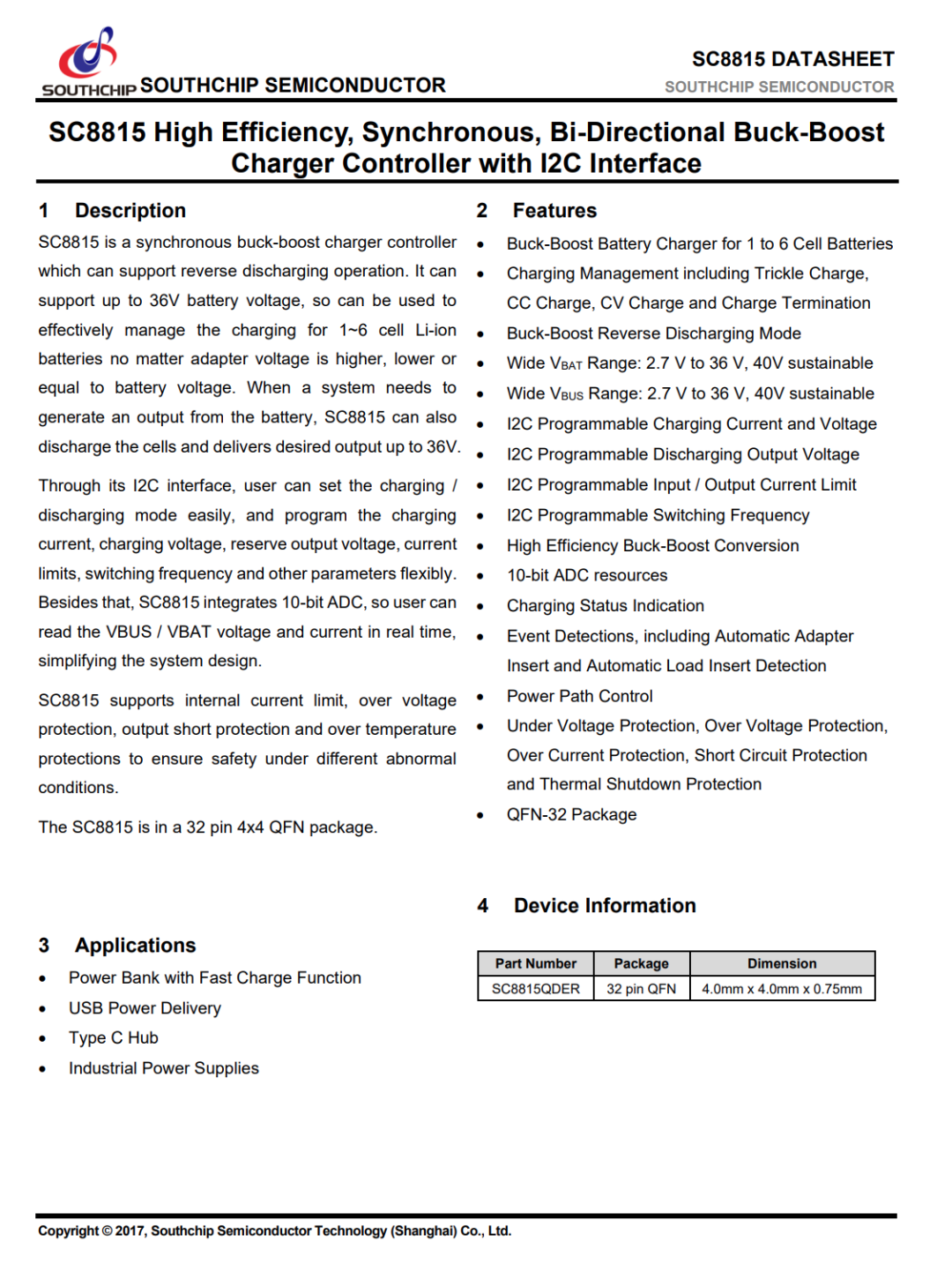USB-C1路升降压芯片来自南芯科技,型号SC8815,用于直流输入升降压电压转换,为内置电池充电及USB-C接口输出。SC8815是一颗集成了I2C接口的双向同步升降压控制器,支持2.5-36V输入和输出电压范围,支持为电池充电,其中电池充电电流和电压,反向放电输出电压,输入输出电流限制均可由I2C总线控制,芯片具备欠压保护、过压保护和过流保护,并且支持短路保护和过热关断保护。