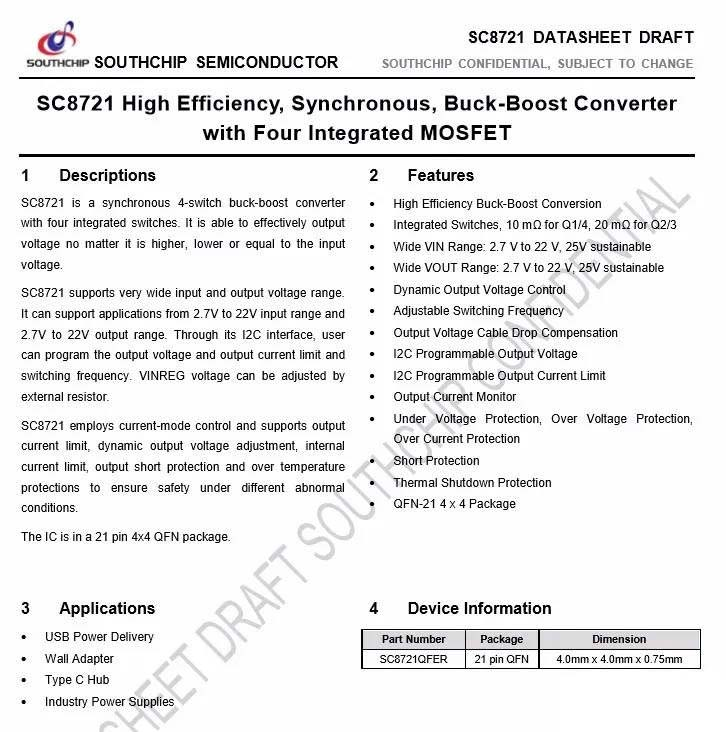 SC8721集成了I2C功能,方便客户使用控制芯片,用户可通过I2C配置输出电压,输出电流限流及开关频率。SC8721采用电流控制模式,支持输出电流限流,动态输出电压调整,内部电流限流,输出短路保护及过温保护,SC8721采用21pin 4*4 QFN封装。