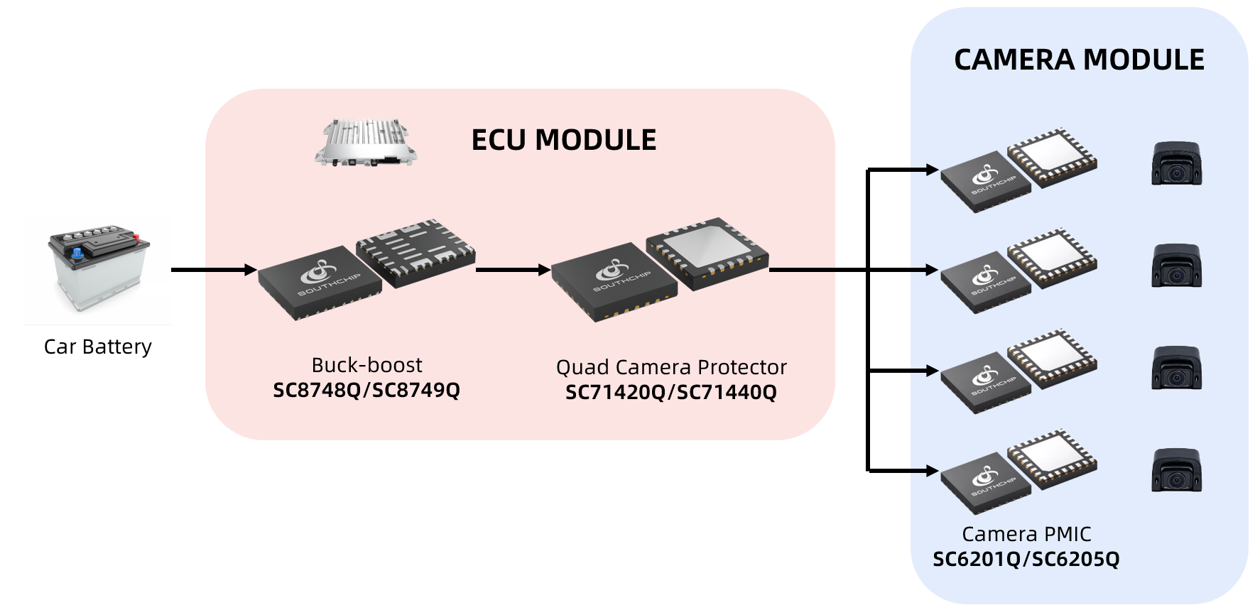 南芯科技此前已量产两款高性能车载摄像头 PMIC 芯片——SC6201Q SC6205Q,应用于摄像头模块,提升单个摄像头的可靠性、效率和抗噪声能力。如下图所示,本次发布的两款产品则聚焦电源链路的前端,从 ECU 侧提供更全面的保护,除了视觉摄像头之外,还可用于毫米波雷达和超声波雷达,进一步强化在 ADAS 领域的产品布局,为客户提供全链路的方案支持。
