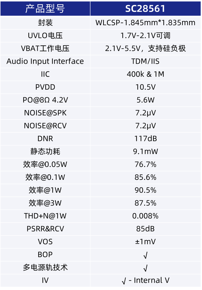 今日,南芯科技(证券代码:688484)发布全新音频功率放大器系列,包含 10.5V 版本 SC28561 及 9.5V 版本 SC28376,可灵活适配不同品质及价位的智能手机的音频电压需求。该系列芯片具备超低待机功耗和超高电源转换效率,可显著延长智能手机的音频使用时间。其中,SC28561 待机功耗低至 9.1mW,较同类产品降低 43.7%;在 1W 常用功率段下,电源转换效率高达 90.5%,且 UVLO 低至 1.7V,适配硅负极电池发展趋势,为用户创造澎湃、纯净且长续航的音频体验,标志着南芯向声学市场的新开拓。