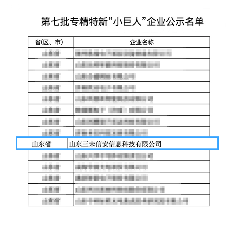 近日,山东省工业和信息化厅公示了第七批国家级专精特新“小巨人”企业名单,三未信安子公司山东三未信安信息科技有限公司成功入选,专业实力、创新能力、特色化优势及市场竞争力获得国家权威认可!